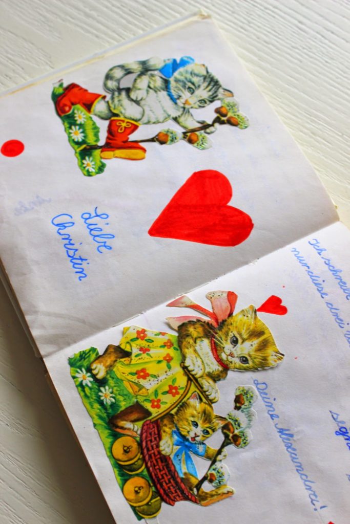 Ich habe noch eine Schachtel mit den Bildchen. Ich bin da sehr sparsam mit umgegangen. Der Ausschnitt aus dem Poesiealbum ist so typisch. Die Handschrift, die Katzenbilder, die, mit Tintenkiller korrigierten Zeilen, lustig!