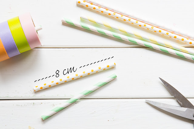 Material: 1 Strohhalm / feste Pappe / gemustertes Papier / Decopatch Kleber (Mod Podge)