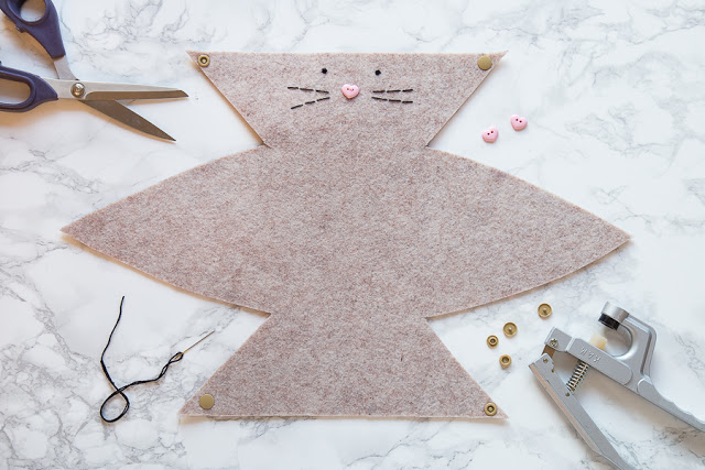 Anschließend werden mit dem schwarzen Stickgarn Augen und Barthaare genäht .