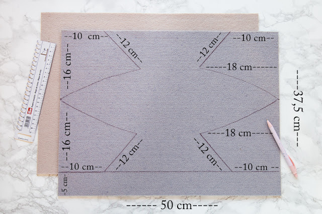 Zuerst schneidet Ihr an einer der langen Seiten der Filzplatte einen 5 cm breiten Streifen ab.